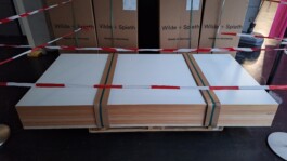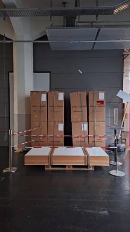 Die noch verpackten Stühle und die angelieferten Tischplatten im Innehof der HfG