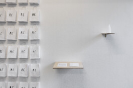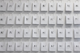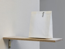 Die Arbeit hohe Kante hat Marleine Chedraoui für das Open House! des Künstlerhaus Stuttgart entwickelt. Die als performative Installation präsentierte Edition hat eine Auflagenhöhe von achtzig. An der Wand des Ausstellungsraums sind alle Papiertragetaschen in acht Reihen und sieben Spalten angeordnet. Sie beinhalten jeweils eine handelsübliche Butterbrottüte, die mit dem Titel der Arbeit auf dem oberen Ende im Siebdruckverfahren bedruckt ist. Auf der einen Seite befindet sich zum oberen Rand der Butterbrottüte hin gerichtet das Wort „hohe“ und auf der anderen Seite fortlaufend nach unten gerichtet das Wort „Kante“. Die zugeklebte Butterbrottüte enthält sieben getrocknete Erbsen. Ein weiterer Inhalt der jeweiligen Papiertragetasche ist ein DIN A5 Blatt, auf dessen Vorderseite die Textcollage, die Chedraoui für diese Arbeit erstellt hat sowie auf dessen Rückseite die Angaben zur Arbeit abgedruckt sind. Es dient zugleich als Zertifikat. Auf den Papiertragetaschen hat die Künstlerin mit schwarzer Acrylfarbe ihre Initialen gemalt. Rechts von den an der Wand installierten Papiertragetaschen sind zwei Holzbretter angebracht. Auf dem kleineren, das höher platziert ist, befindet sich eine der Butterbrottüten und auf dem anderen sind zwei der Zertifikate in Vorder- und Rückansicht unter Glas gezeigt. Sobald ein Exemplar erworben wird, entnimmt die Käuferin oder der Käufer dieses von der Wand.