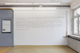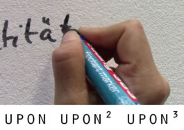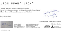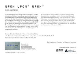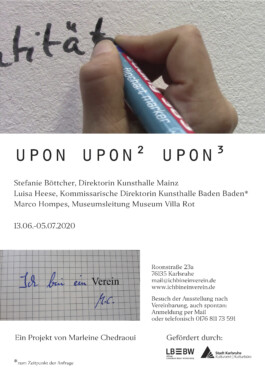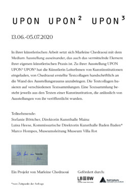 Zu Ich bin ein Verein | UPON UPON² UPON³ hat Marleine Chedraoui Leiter:innen von Kunstinstitutionen eingeladen, von ihr erstellte Textcollagen handschriftlich an die Wand des Ausstellungsraums anzubringen. Die Textcollagen basieren auf verschiedenen Textsammlungen. Eine Textsammlung besteht jeweils aus den Texten der Kunstinstitution, die anlässlich von Ausstellungen von ihr veröffentlicht wurden.