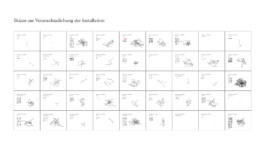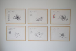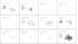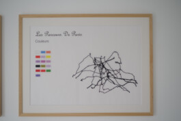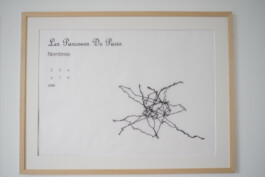 The work Les Parcours De Paris is an installation consisting of forty-five panels. On each of these panels there is a representation of one of the forty-five categories freely chosen by Marleine Chedraoui. The representations are based on information from the nomenclature of the streets and the city map of Paris. For each selected category, the artist researched the corresponding elements and then checked whether they appear in the street names of Paris. From the street names filtered in this way, Chedraoui created a course for the respective category and visualised the corresponding elements on the left-hand side of the panel.