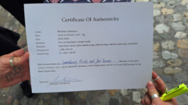 Die Trolleys waren mit mehreren Objekten beladen. Jedes Objekt besteht aus einem Schild und einer eigens dafür angefertigten Tasche aus Luftpolsterfolie. An der Tasche ist eine Lieferscheintasche befestigt, die das dazugehörige Zertifikat enthält. Beim Kauf wurde der Name der Käufer:in als am Projekt beteiligte Person auf dem Zertifikat vermerkt.